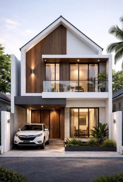 Fasad dirancang dengan komposisi bentuk yang proporsional dan material yang mudah dirawat. Pendekatan ini membuat rumah tampil modern tanpa harus menggunakan elemen berlebihan.